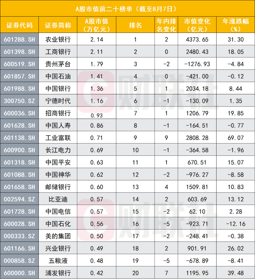 这期间,银行股在A股市值榜单的权重也在提升。截至8月7日,A股市值前二十中,银行股占据了7个席位,与去年底相比增加了1位。